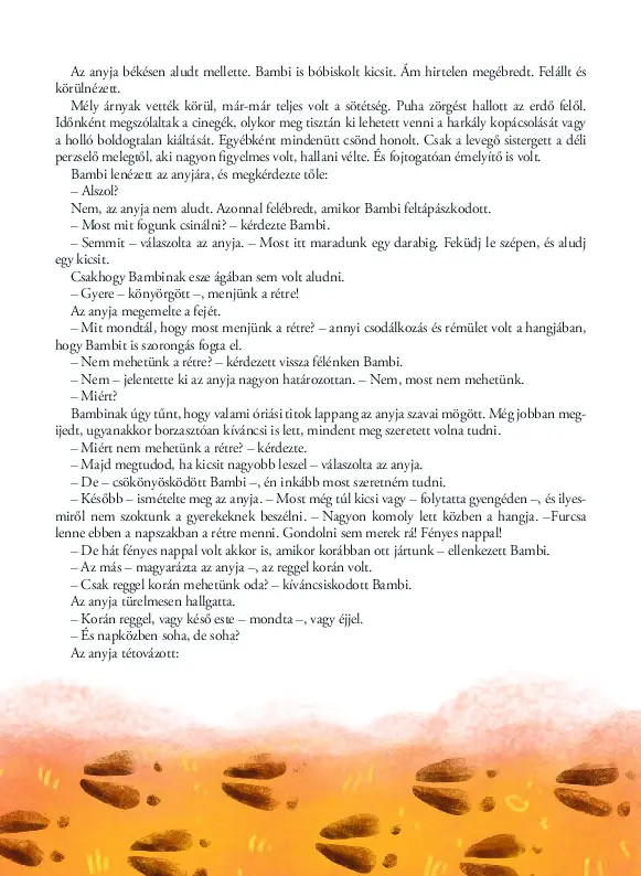 Félix Salten népszerű meséjének az állatkái egy erdei közösségben élnek, beszélnek egymással, tudnak egymás dolgairól, mintha emberek volnának. Az olvasó Bambival, a kis őzikével együtt tanul meg játszani, elkerülni a veszélyeket, élvezni a szabadságot. A kegyetlen valóságot azonban nem kívánja megszépíteni az író; megjeleníti a halált, az életért folytatott küzdelmet, és a könyörtelenséget is. A meséhez készült varázslatos illusztrációk még inkább kiemelik a történet szépségét.